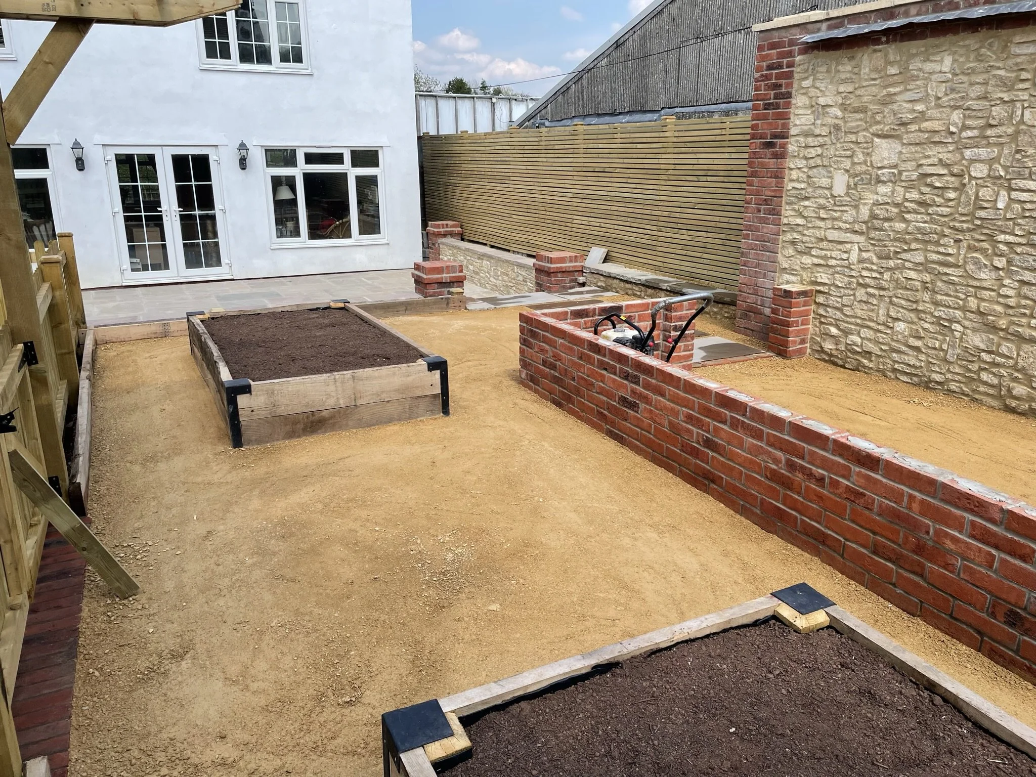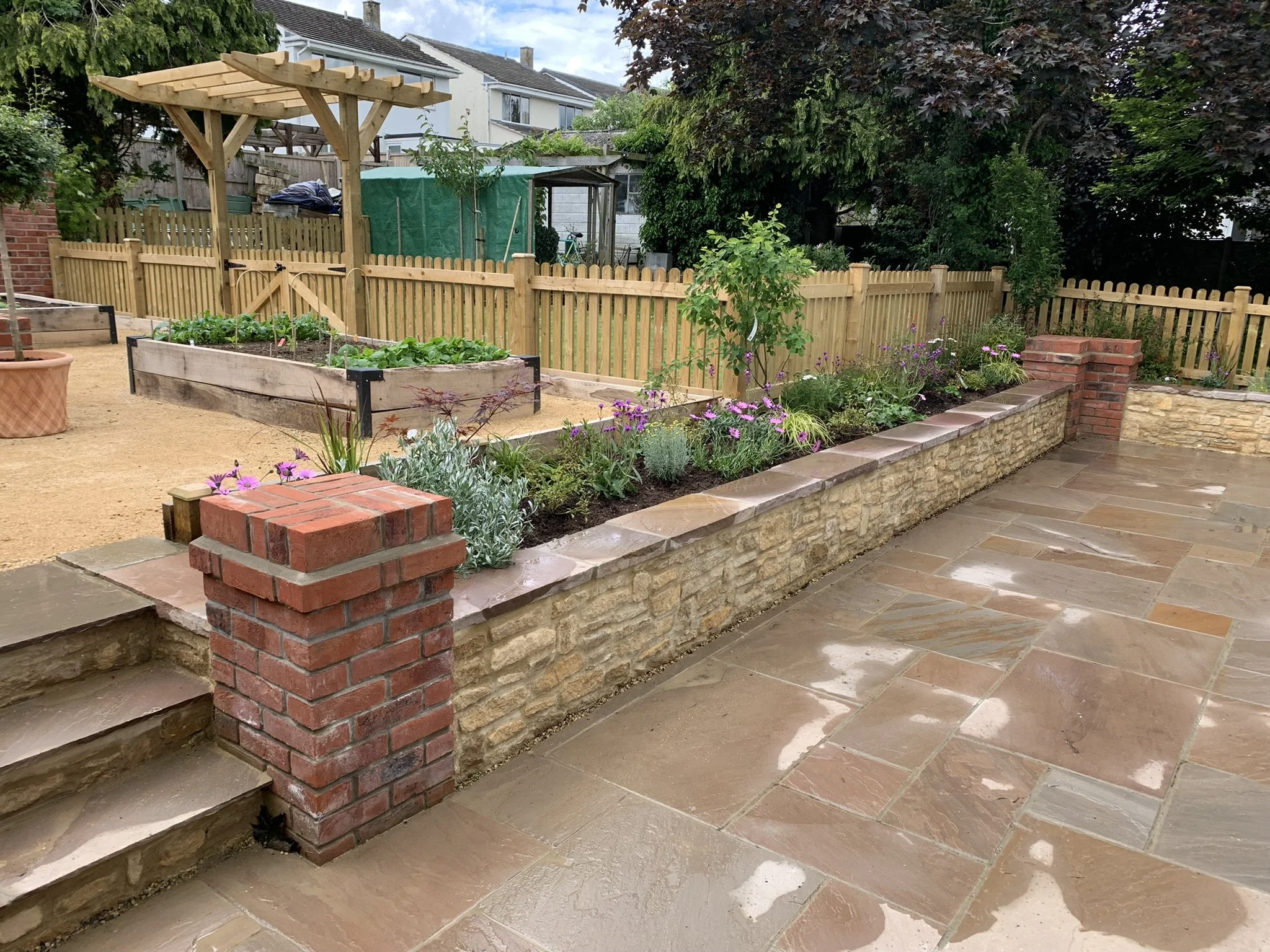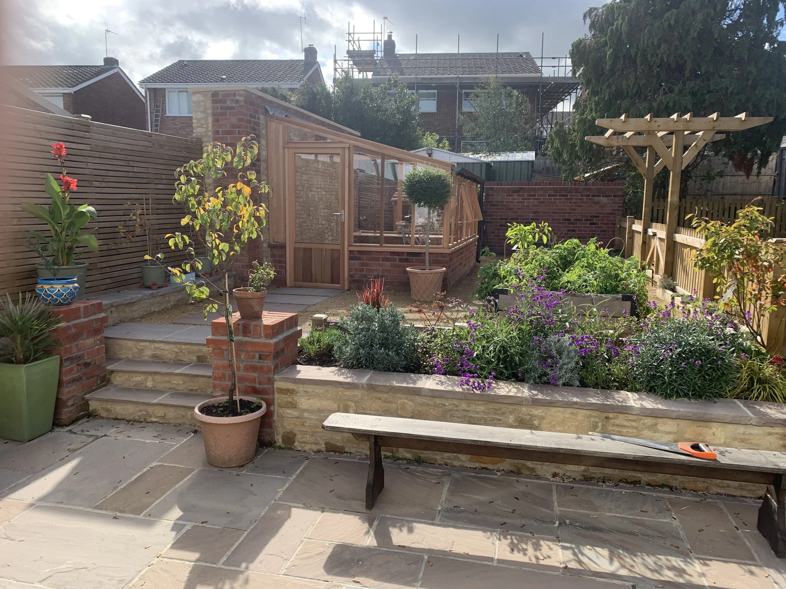 Rich cedar and natural stoneChipping Sodbury Natural stone walling, paving and steps lead to a formal kitchen garden with a new cedar greenhouse.Further details coming soon….