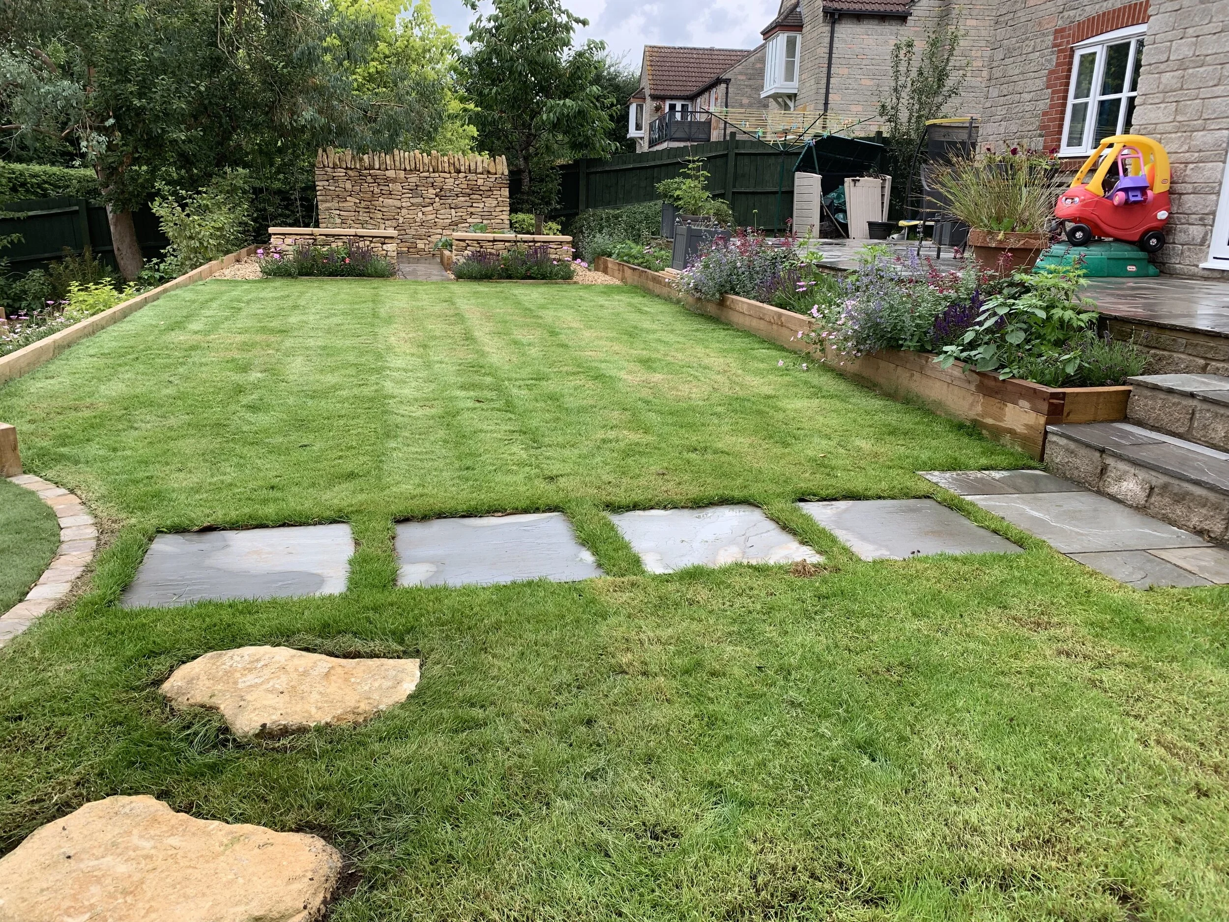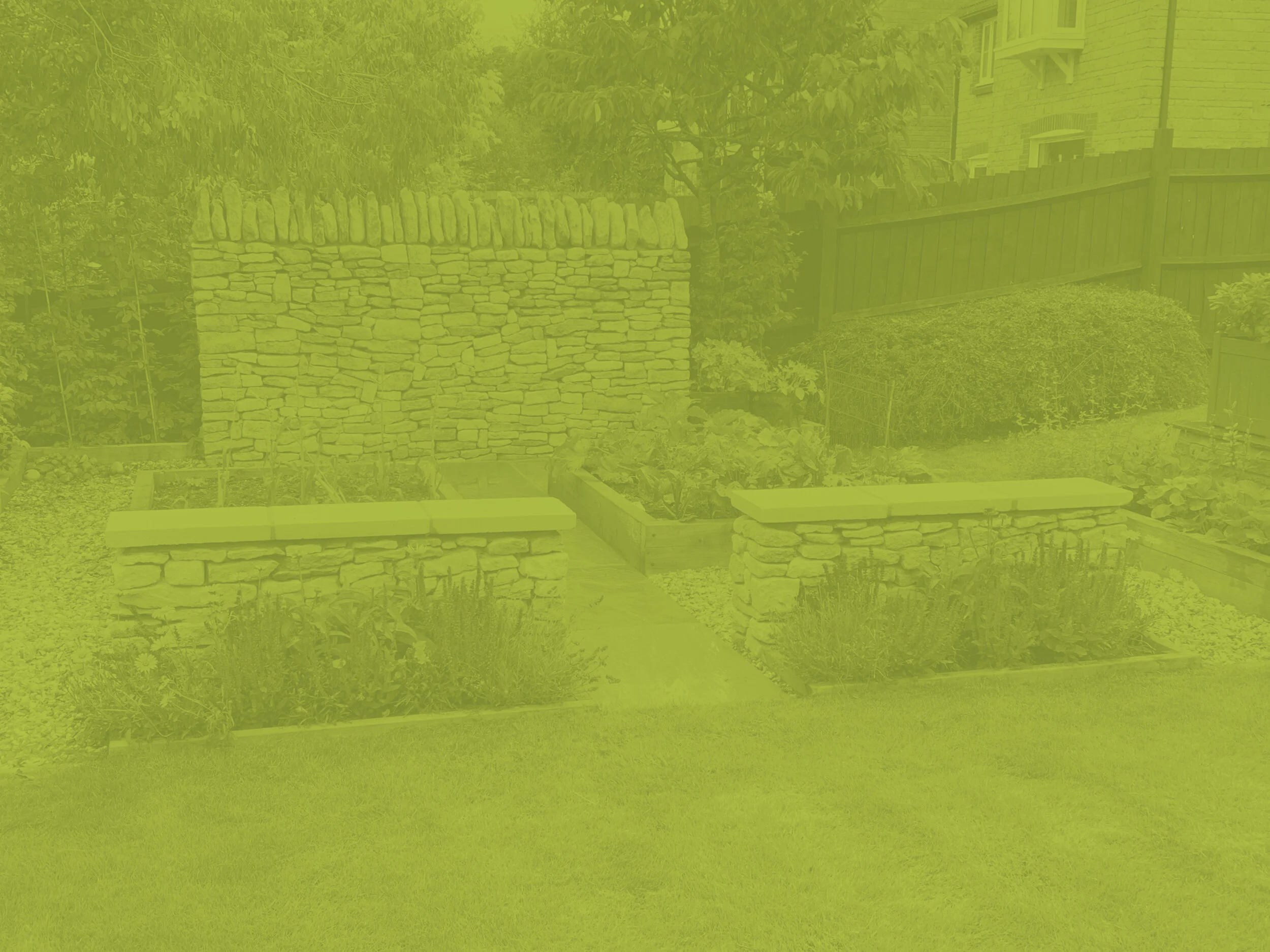 A new terrace patio in conjunction with a house extension left the original garden with poor links to the house so the brief on this project was to level up areas of the garden and to include a new lawn, raised planters for fruit and veg and a woodland firepit area.