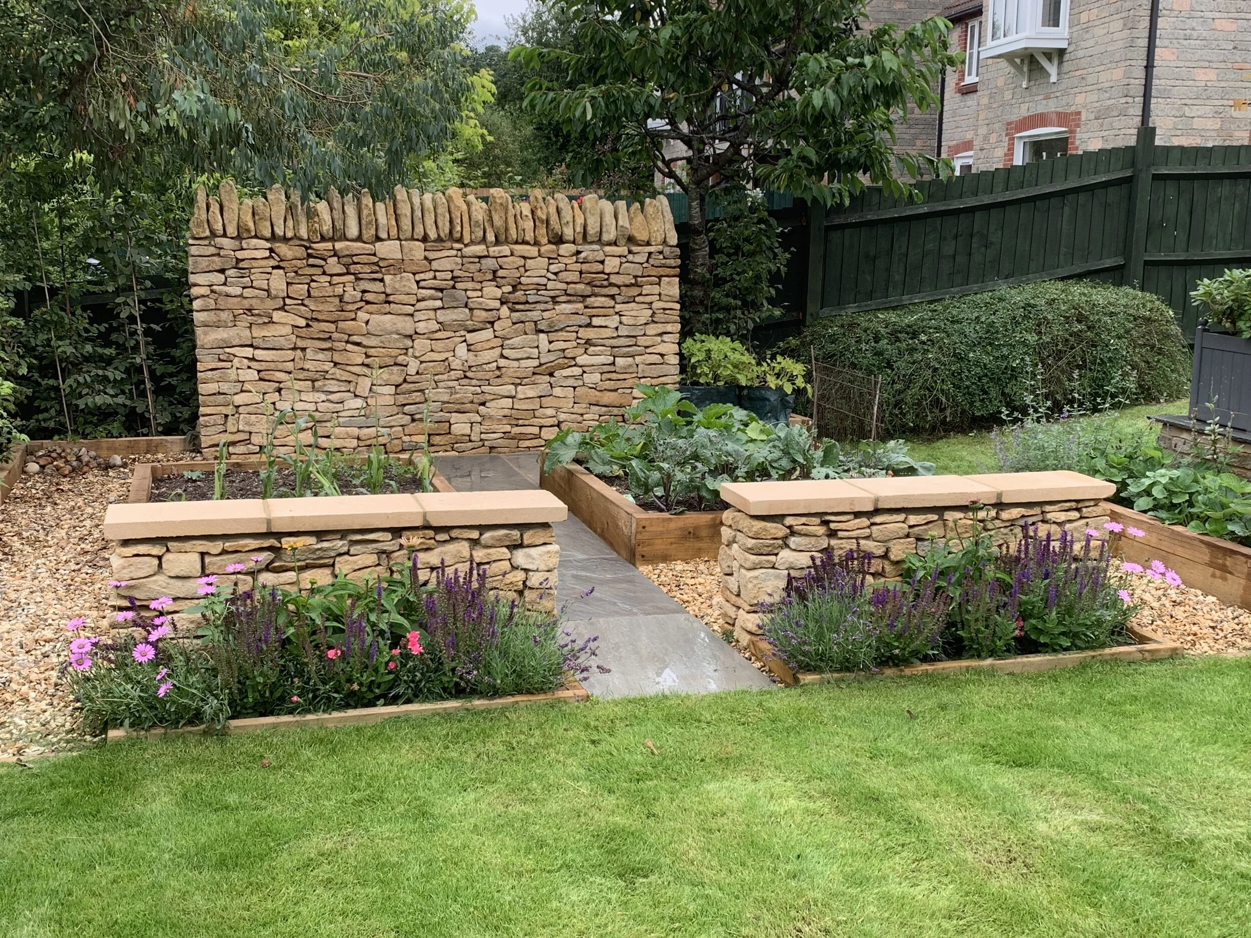 Our design incorporated a feature kitchen garden at the end of the new lawn which brought in characteristics of the surrounding rural setting with use of dry stone walling. A circular artificial lawn provides an all year round play area for the little ones and the levelling of the lower part of the garden includes woodland planting and a firepit area for cosy evenings spent toasting marshmallows.
